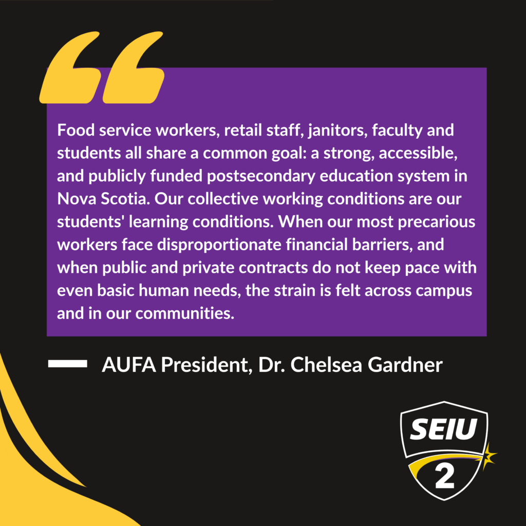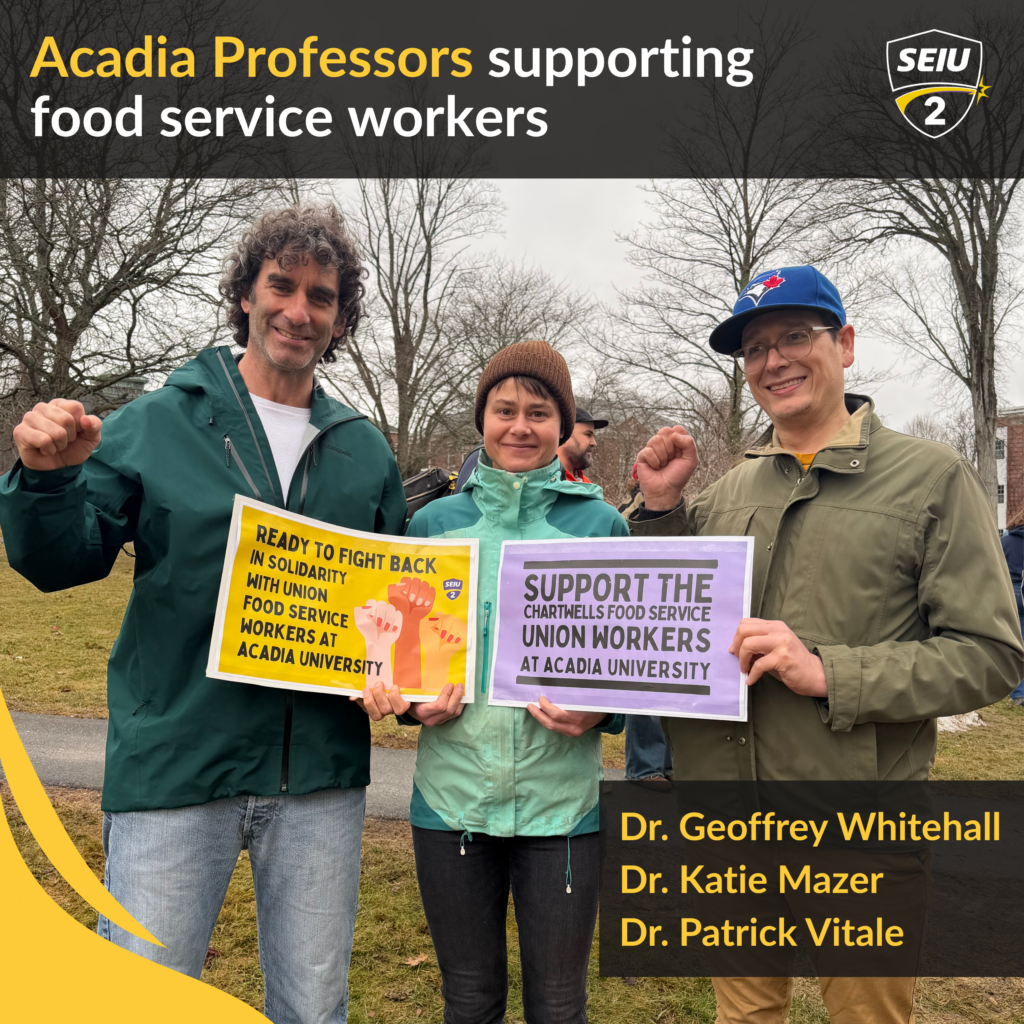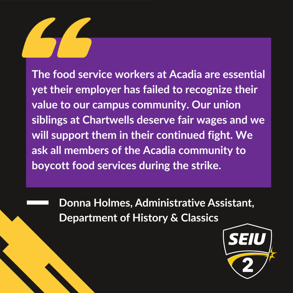 The Acadia community in Wolfville is stepping up to support the SEIU2 members including students, faculty and area residents. Many have made public statements of support and some have called for a boycott of Chartwells should a strike proceed.